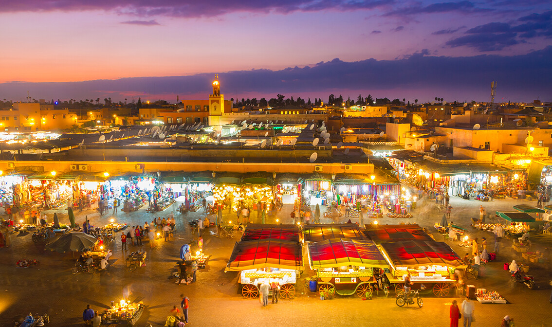 Odlazak na razgled grada: Saadienske grobnice, palača El Badi, Bahia, grobnice Saadiens, berberska ljekarna. Slobodno vrijeme za šetnju pravim labirintom ulica živopisne tržnice. Moguć razgled prekrasnih Yves Saint Laurentovih vrtova Majorelle (uz doplatu). Zatim razgled džamije Koutoubia (izvana) te poznatog trga Djemaâ El Fna, najvećeg trga u Africi i središta noćnog života, gdje možete uživati u posebnoj atmosferi dok ste okruženi plesačima, pripovjedačima, krotiteljima zmija, majmunima izvođačima i akrobatima. Večera u hotelu ili fakultativni odlazak na „Fantasia show uz večeru“. Noćenje.