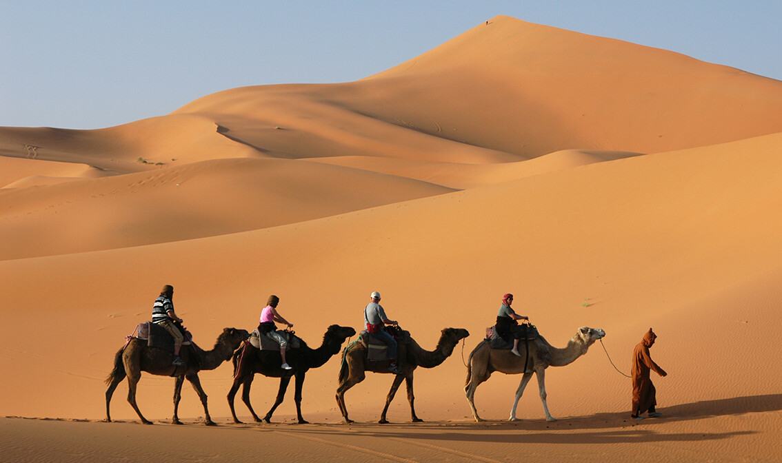 Nakon doručka vožnja „Putem tisuću kasbi“ uz niz oaza u kojima se zelene gusti nasadi palmi i kroz iznimno zanimljiv krajolik prošaran mnogobrojnim kasbama, berberskim utvrdama od blata. Vožnja Dolinom ruža pored grada Kelaat M’gouna. Svake godine u travnju i svibnju lokalno stanovništvo u dolini prikupi nekoliko tisuća tona divljih ruža koje se zatim prerađuju u Kelaat M'gouni u razne kozmetičke artikle, koje ćete moći kupiti ili samo pomirisati prilikom kratkog zaustavljanja. Nastavak putovanja prema Tinghiru, gradiću u oazi podno Atlasa poznatom po velikim nasadima palmi i obližnjem kanjonu Todra. Impresivni kanjon je prirodni fenomen nastao djelovanjem rijeke Todre, čiji tok je nekada sigurno bio daleko snažniji nego danas jer je kroz oštro stijenje izdubio duboki, gotovo sasvim vertikalni kanjon. Dolazak u Erfoud, grad u još jednoj od mnogobrojnih oaza, iskrcavanje iz autobusa te dalje vožnja terenskim vozilima u Saharu. Mogućnost odlaska na jahanje deva navečer ili ujutro ovisno o vremenu dolaska. Večera. Noćenje.