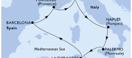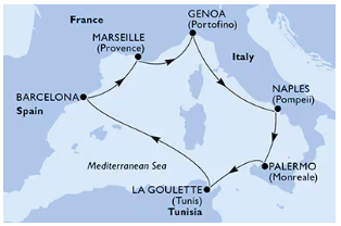 Istražite Napulj i posjetite Pompeje podno vulkana Vezuv, osjetite vibrantni i šareni Palermo - prošećite jadnom od najzanimljivijih tržnica. Po dolasku u Tunis posjetite drevnu Kartagu i prekrasno bijelo plavo selo Sidi Bui Said. U Barceloni prošećite najljepšom tržnicom Europe a u Marseillu prošetajte starom gradskom lukom ili se popnite do crkve Notre-Dame de la Garde ili skoknite do slikovitog mjesta Aix-en-Provence!